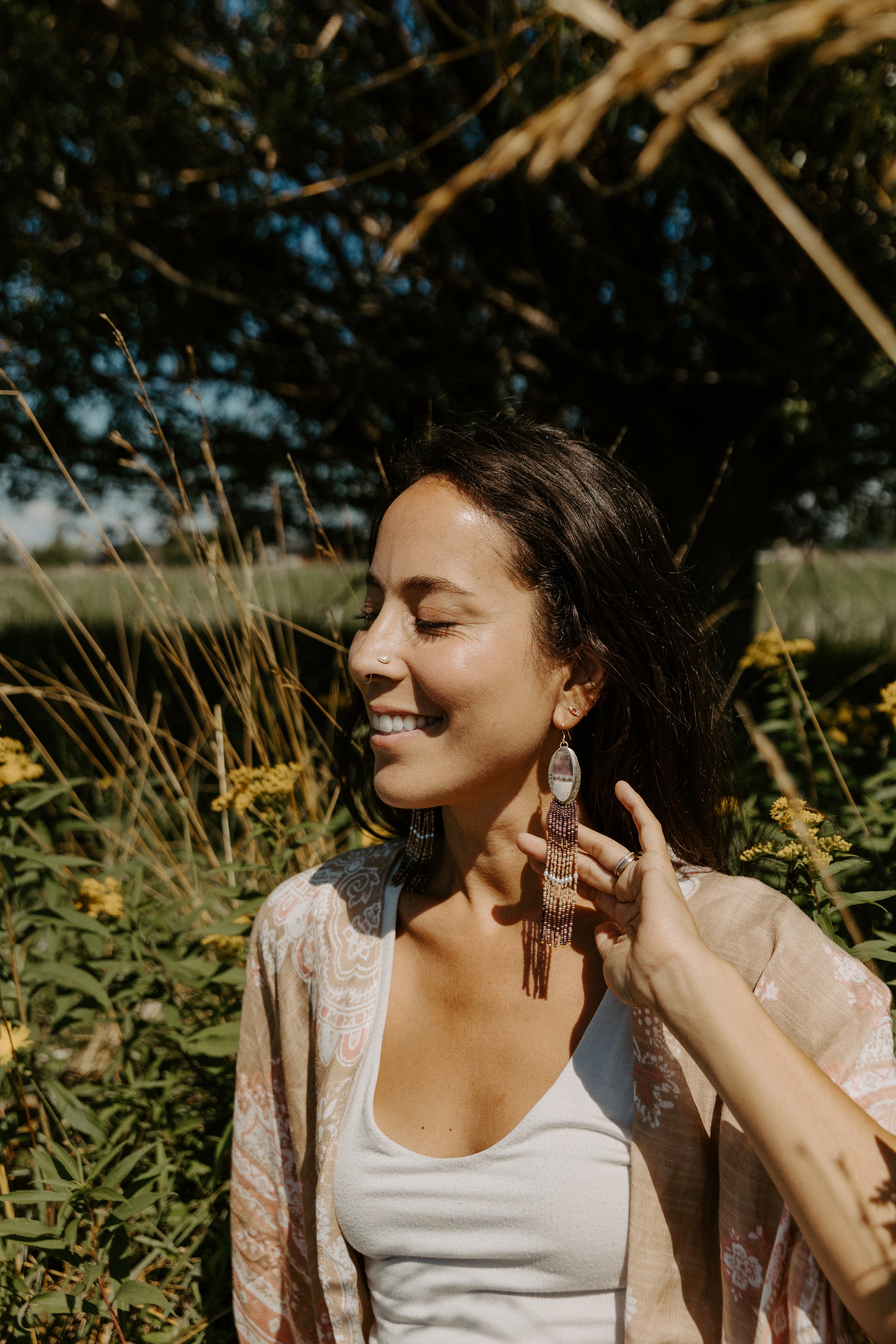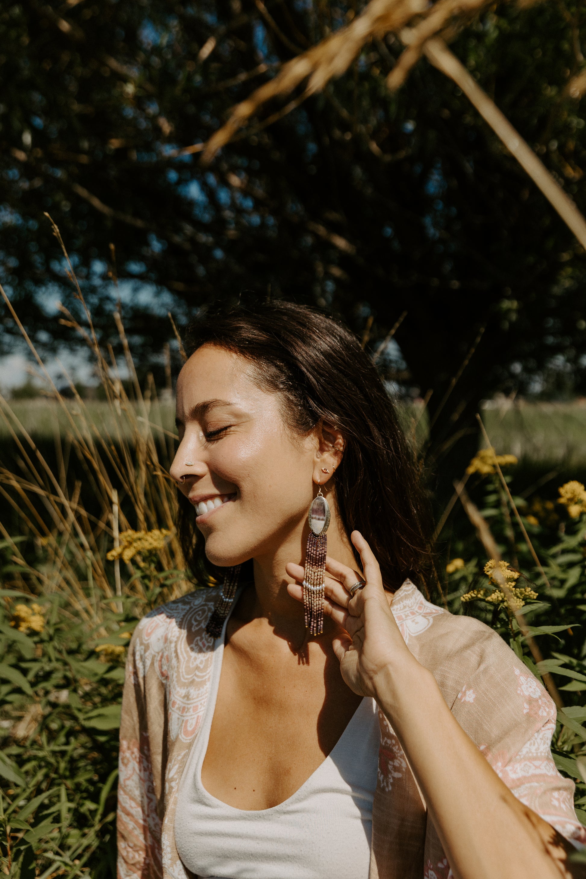 Each pair of earrings is metalsmithed by hand in my Montana studio. From shaping the bezels and soldering the frames to stitching every bead with intention, this is slow craft meant to be felt.
