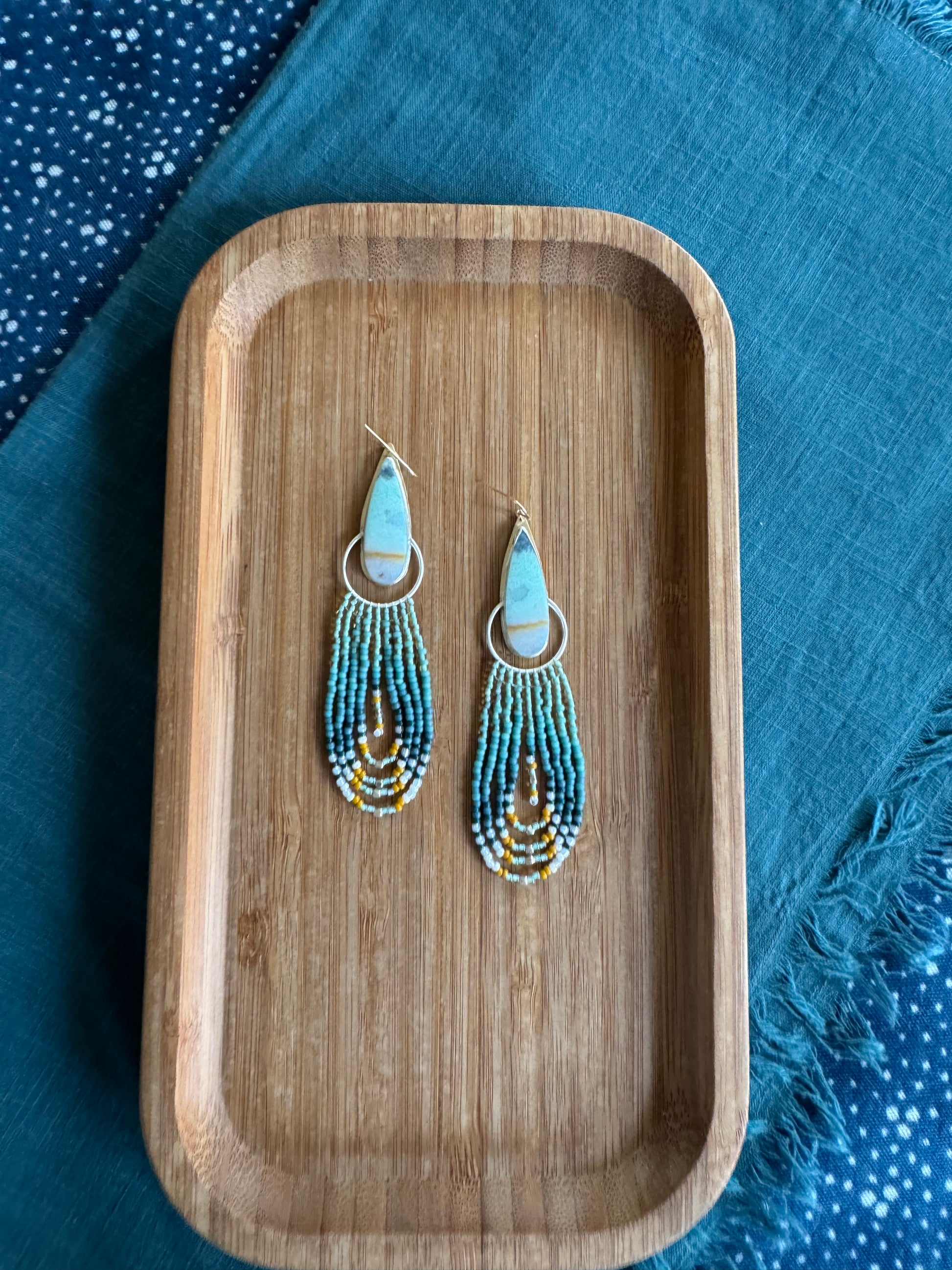 Handcrafted with sterling silver and jeweler’s brass, these earrings feature beautiful blue opalized wood gemstones. Turquoise, teal, and sandy neutrals ebb and flow in this ocean-inspired design. A smaller design to help make you feel gorgeous daily!