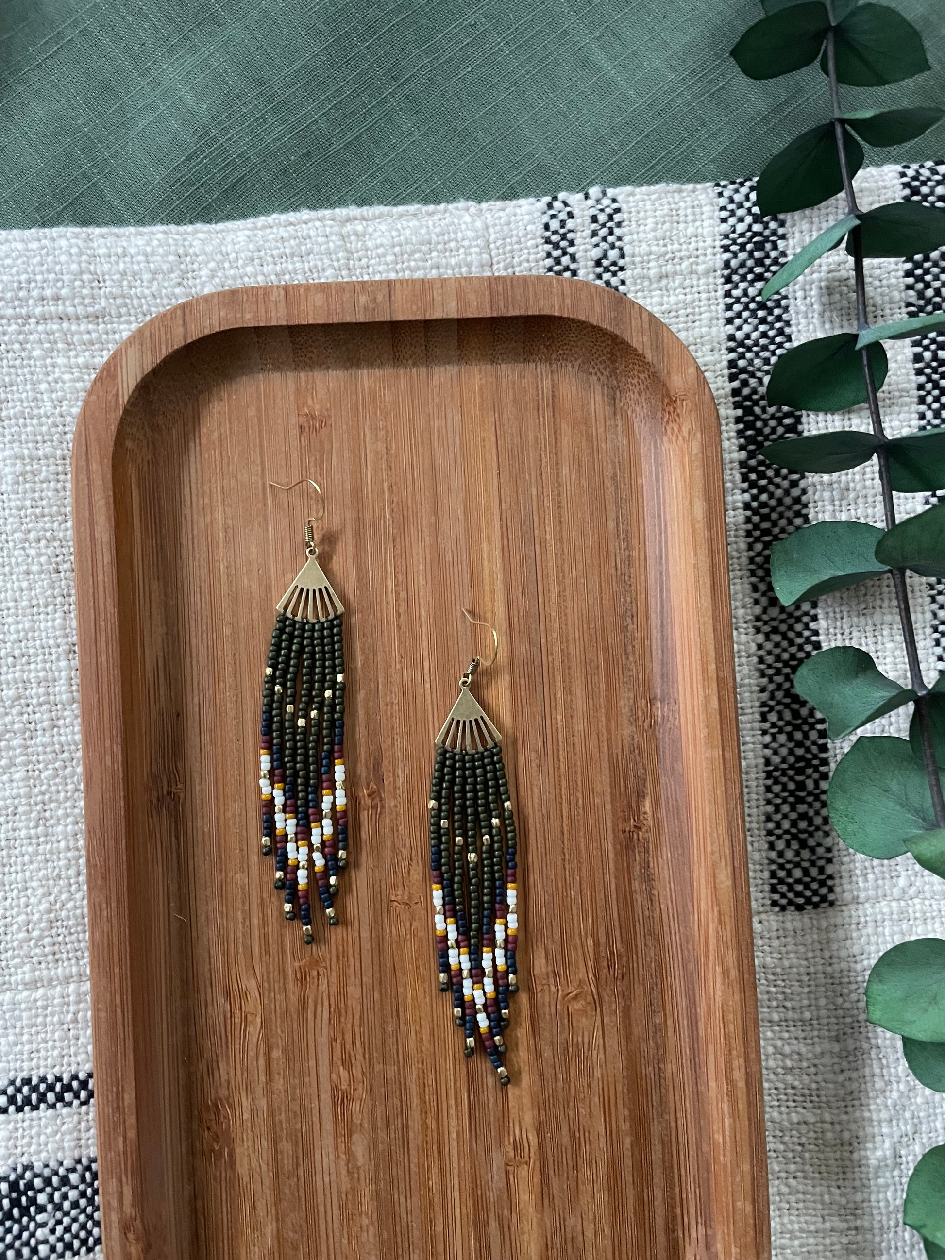 Short flowy fringe earrings in deep forest green, Pendleton palette and gold accents on small gold fans.