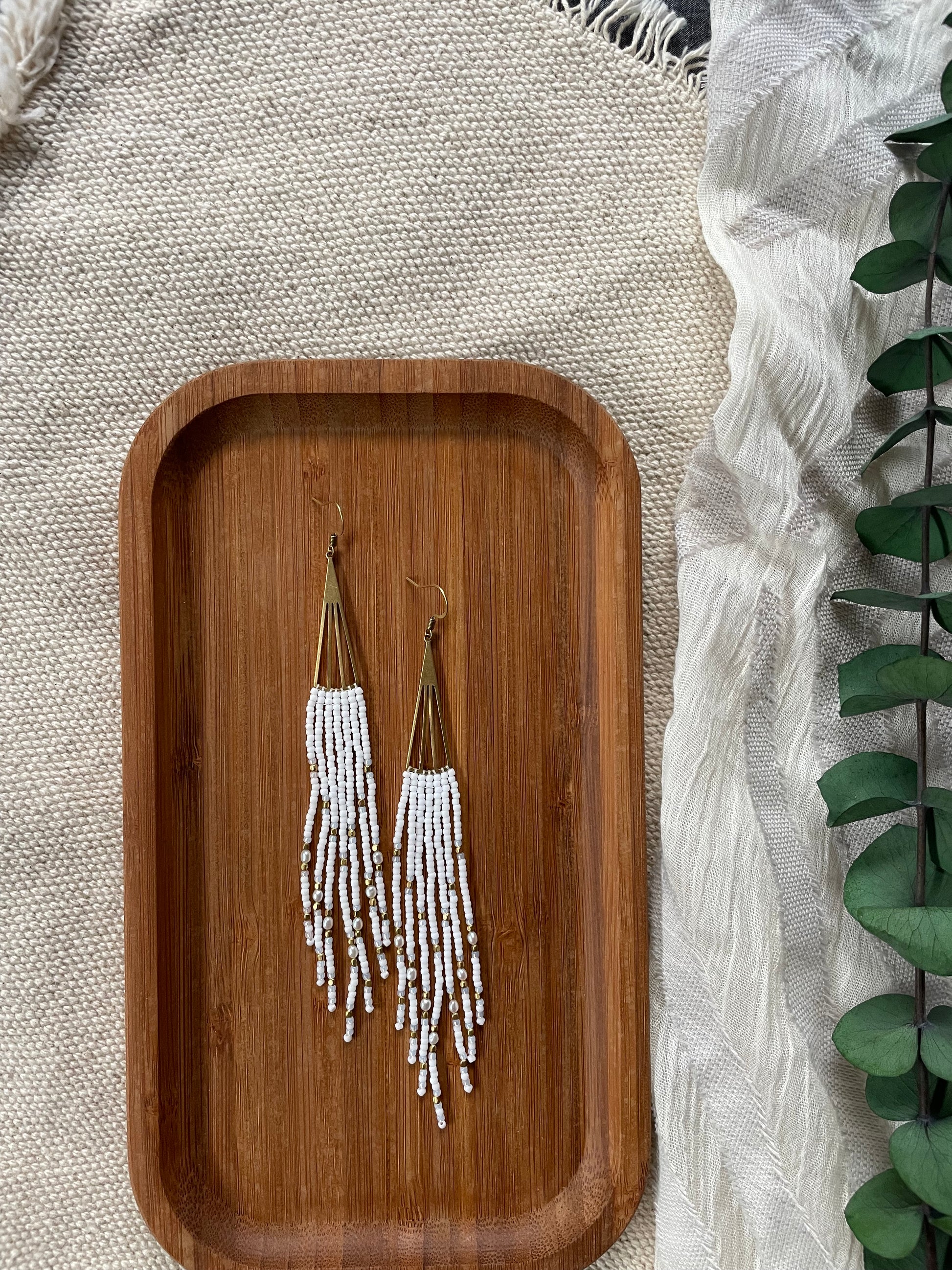 Golden fans in true white with gold accents fringe earrings. Made by hand with love.