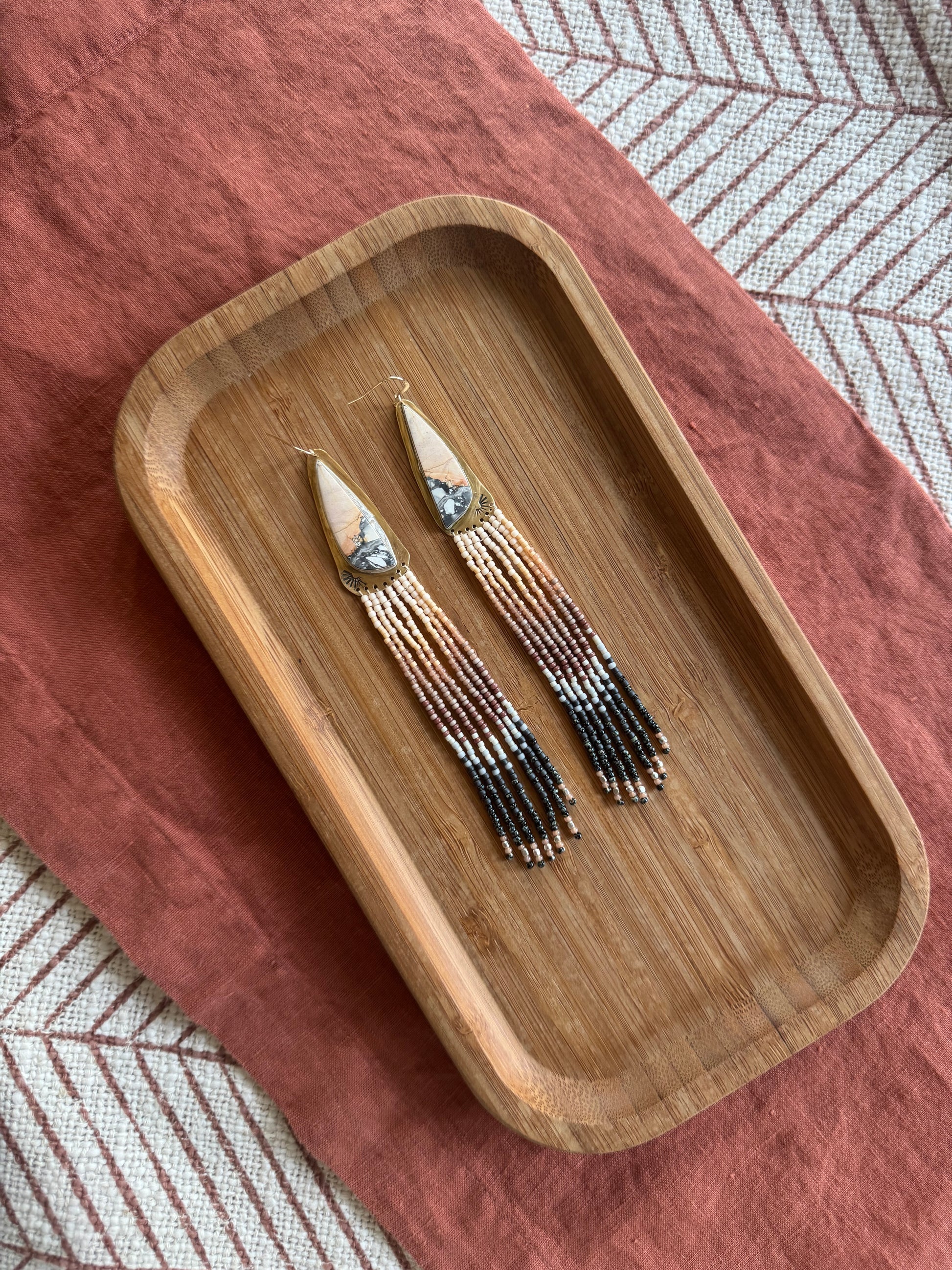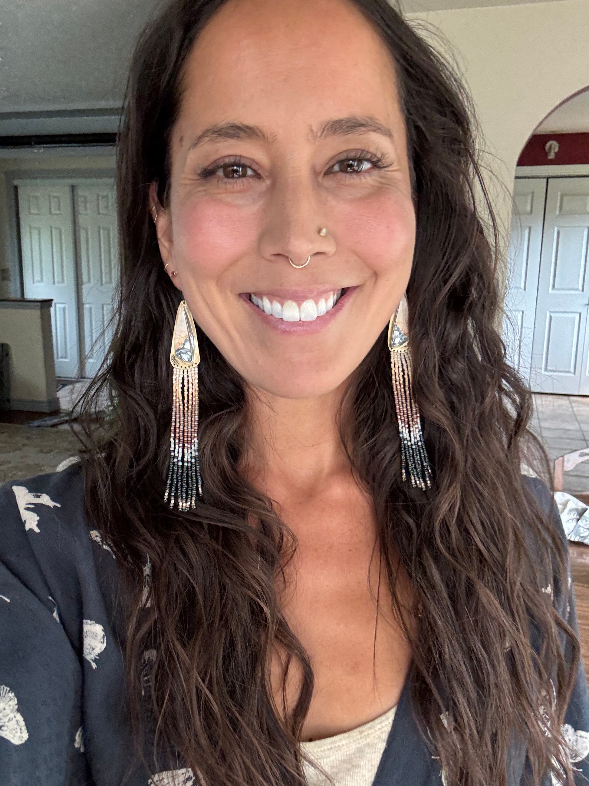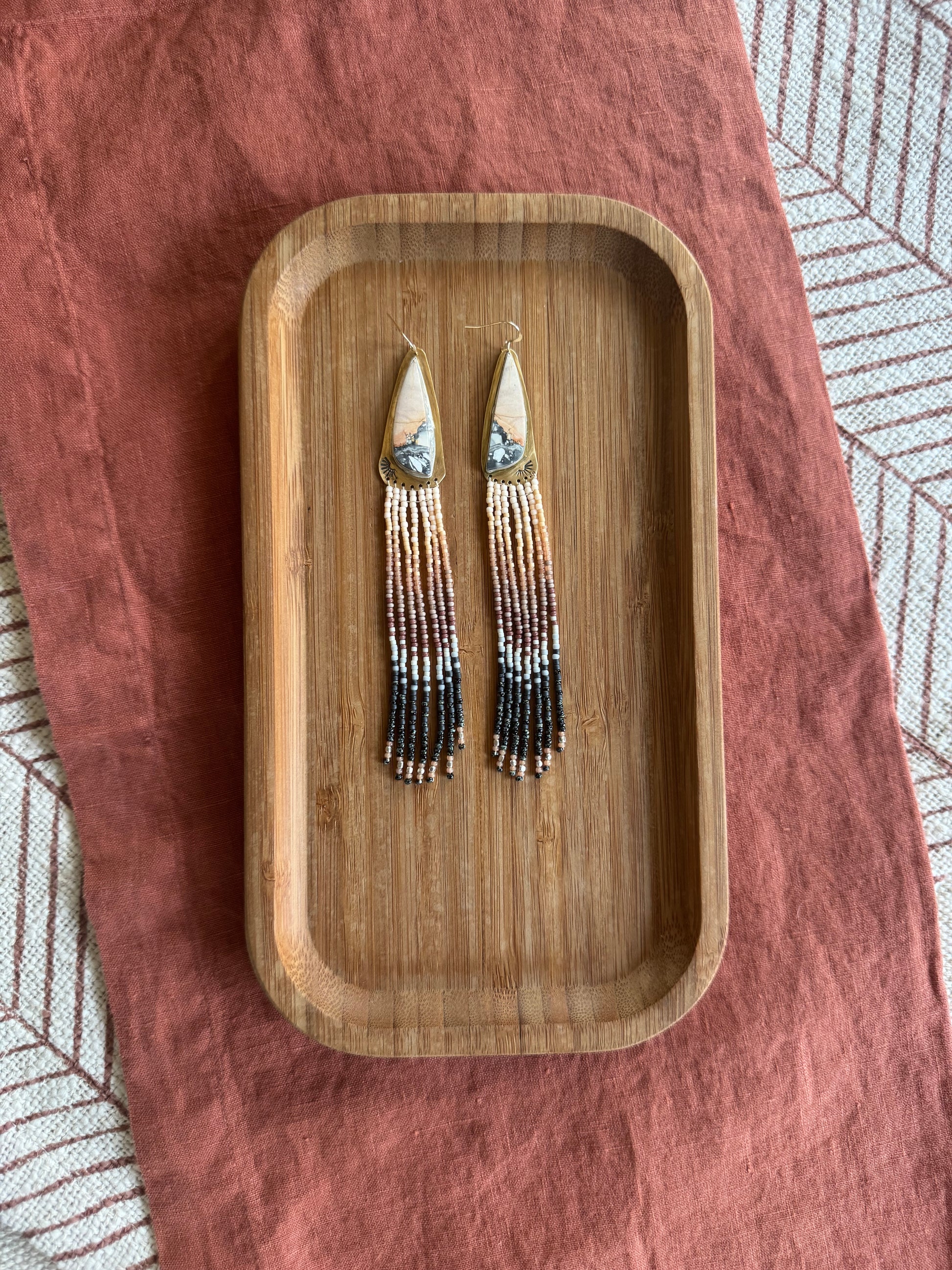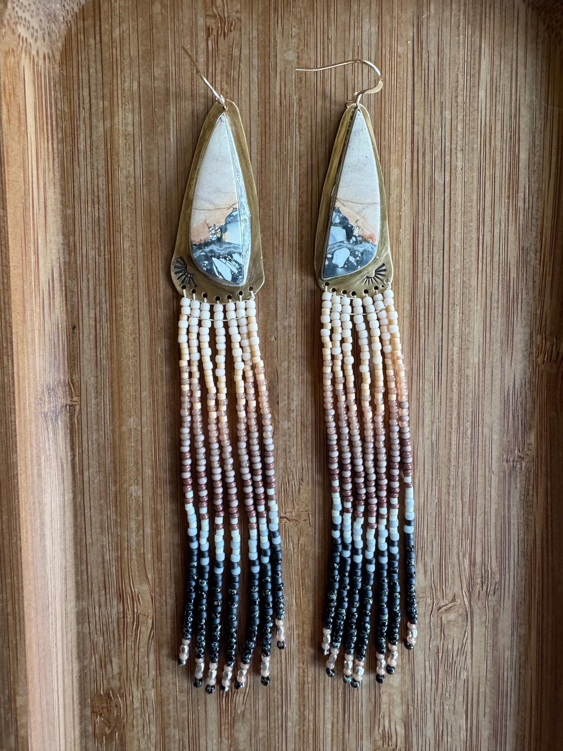 Each pair of earrings is metalsmithed by hand in my Montana studio. From shaping the bezels and soldering the frames to stitching every bead with intention, this is slow craft meant to be felt.