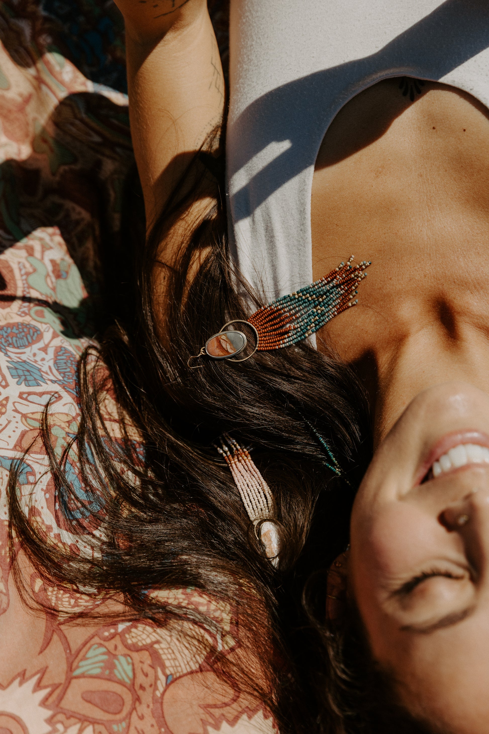 Each pair of earrings is metalsmithed by hand in my Montana studio. From shaping the bezels and soldering the frames to stitching every bead with intention, this is slow craft meant to be felt.