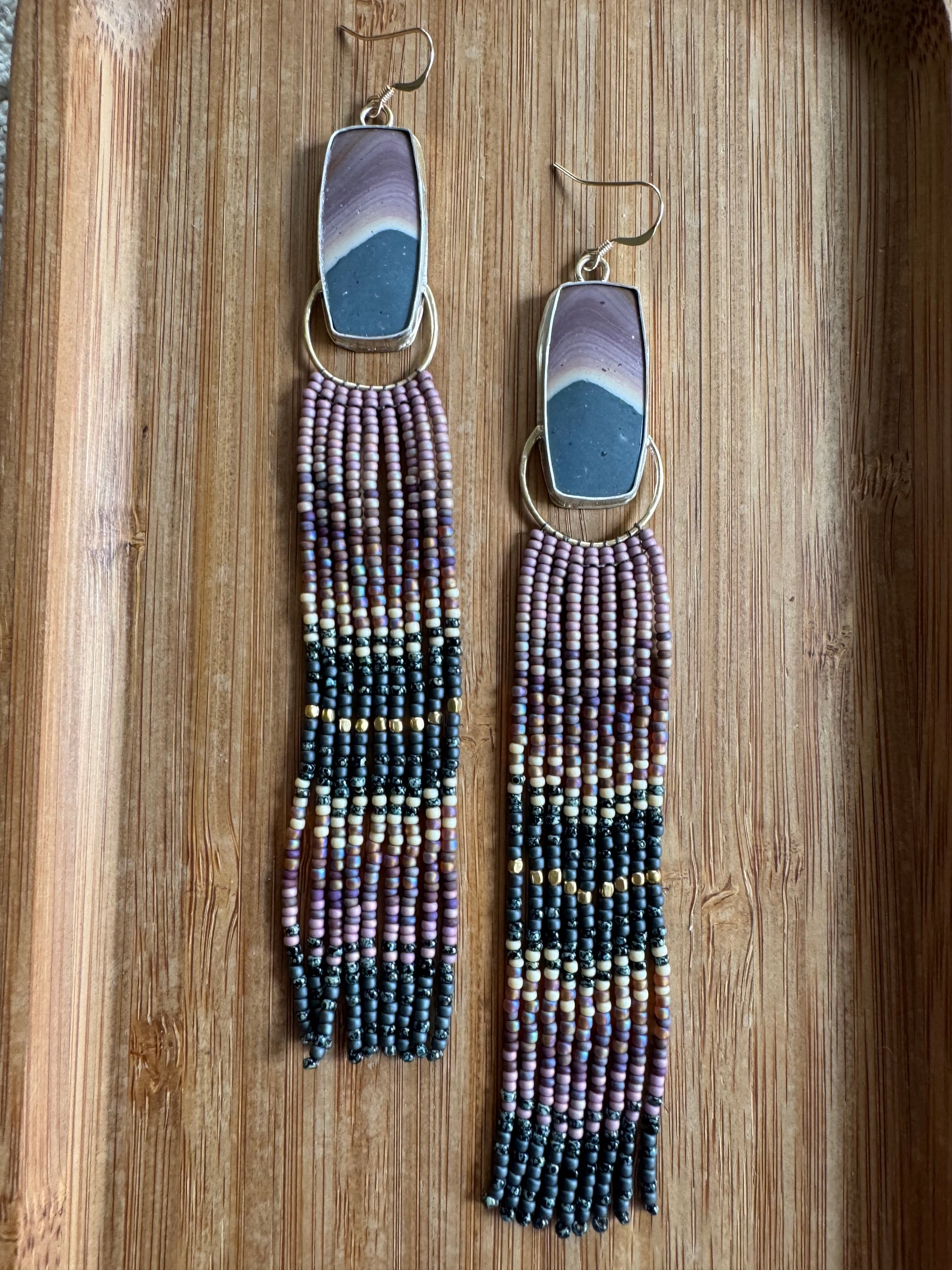 Each pair of earrings is metalsmithed by hand in my Montana studio. From shaping the bezels and soldering the frames to stitching every bead with intention, this is slow craft meant to be felt.