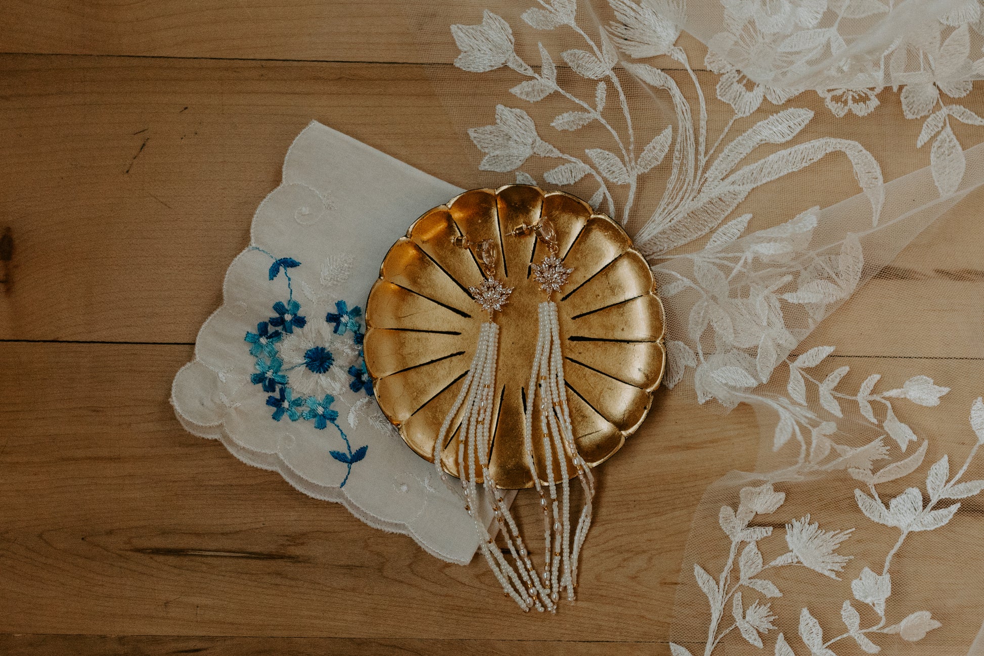 Bridal earrings featuring 24k gold and mother of pearl accents on Japanese glass bead strands with crystal and sterling silver posts.